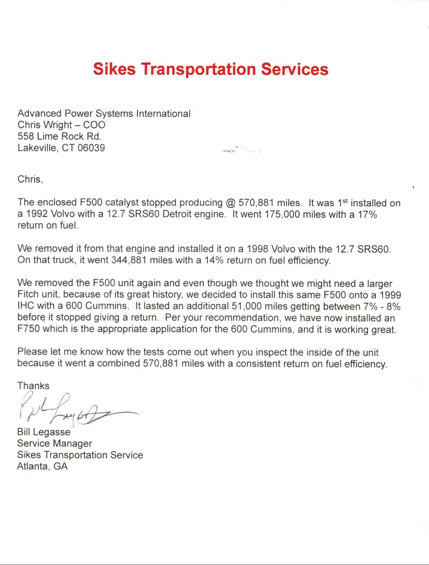 “It is my pleasure to support Advanced Power Systems Int’l. During these challenging economic times, I am proud to say that this Torrington company is dedicated to reducing fuel emissions and improving fuel efficiency. As a City, we have installed the Fitch products in all our plow trucks.