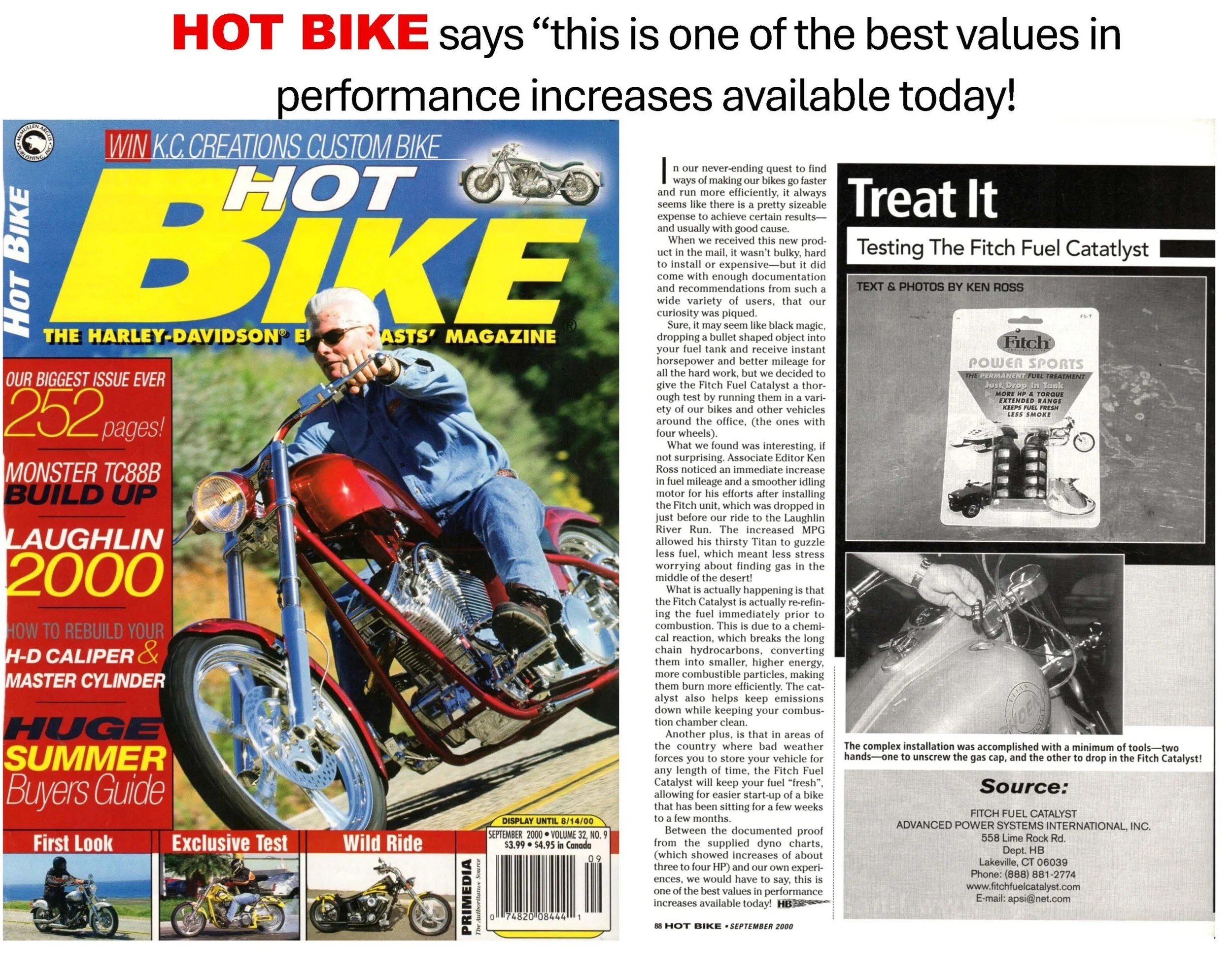 "We have tried the Fitch Fuel Catalyst many times and it really makes a difference. The Fitch Fuel Catalyst cured a hot weather detonation problem on our Buell Cyclone. Throttle response is more crisp. Fuel economy went from 120mpt (miles per 4gal tank) to 137mpt. 4+ more miles per gallon or over 10% more miles per dollar.” Read more