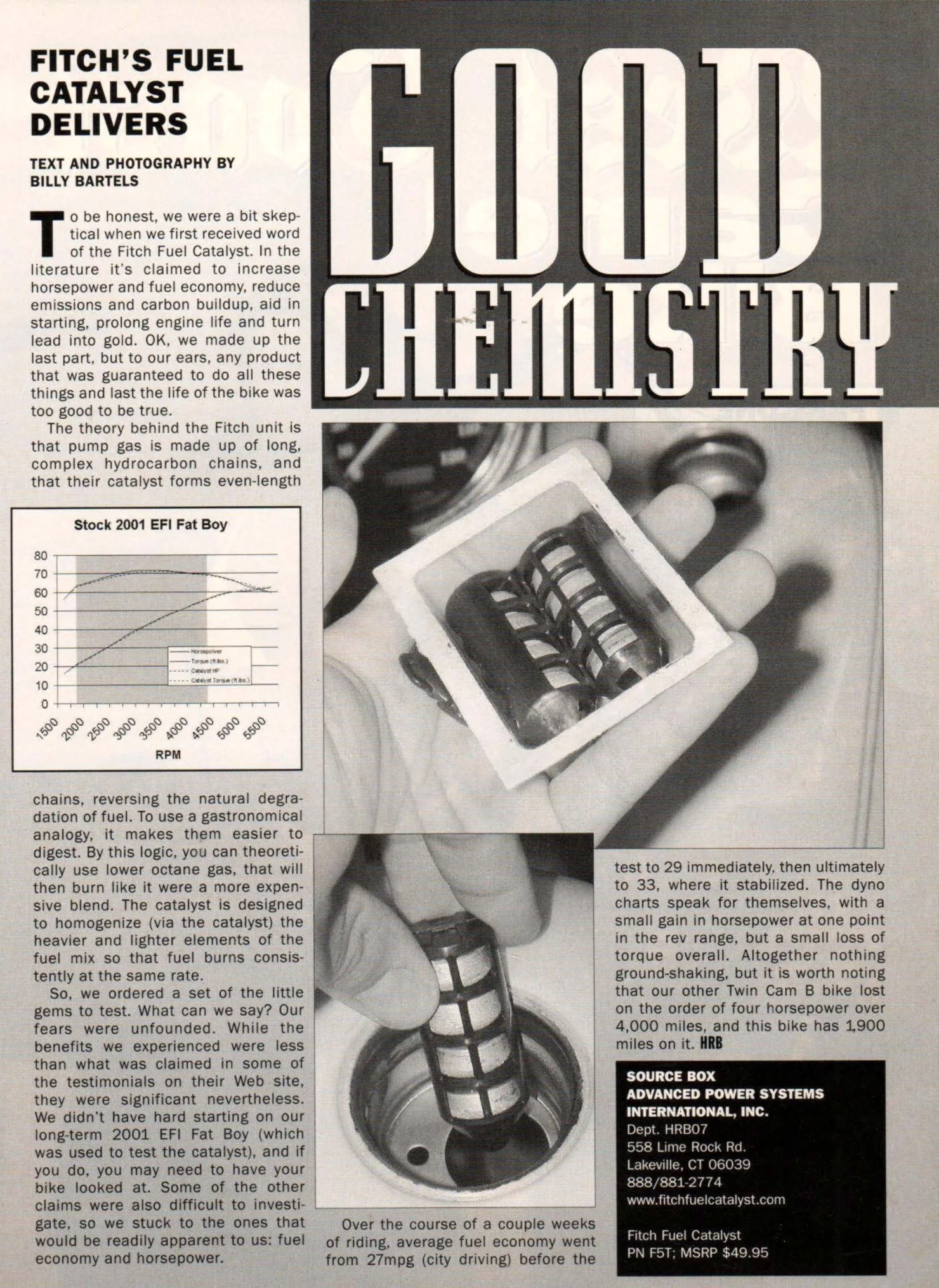 "...using a fuel-injected TC88B (Heritage Softail Springer). Initially our test bike averaged about 38 mpg without the pellets. After running through a couple tanks with the Fitch Fuel Catalyst, the Heritage's fuel economy rose to nearly 42 mpg "